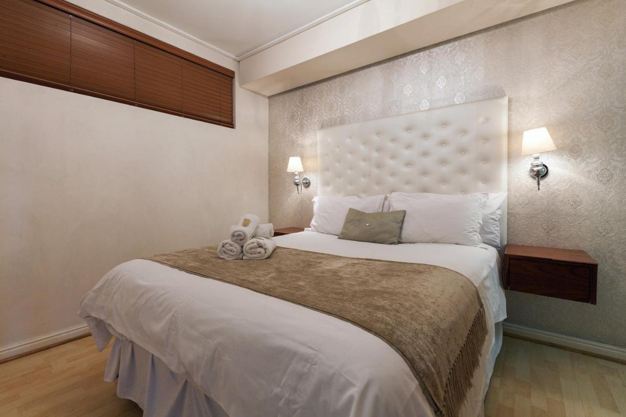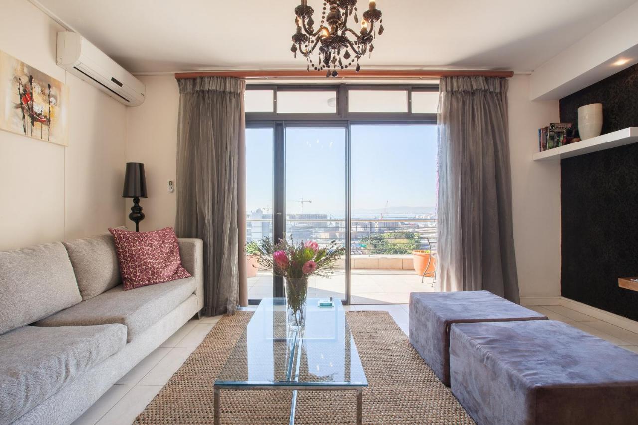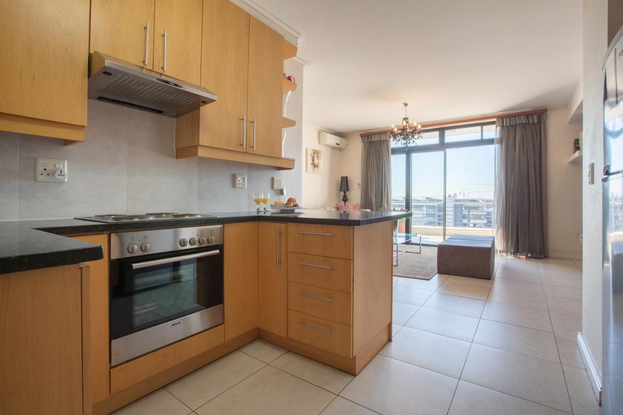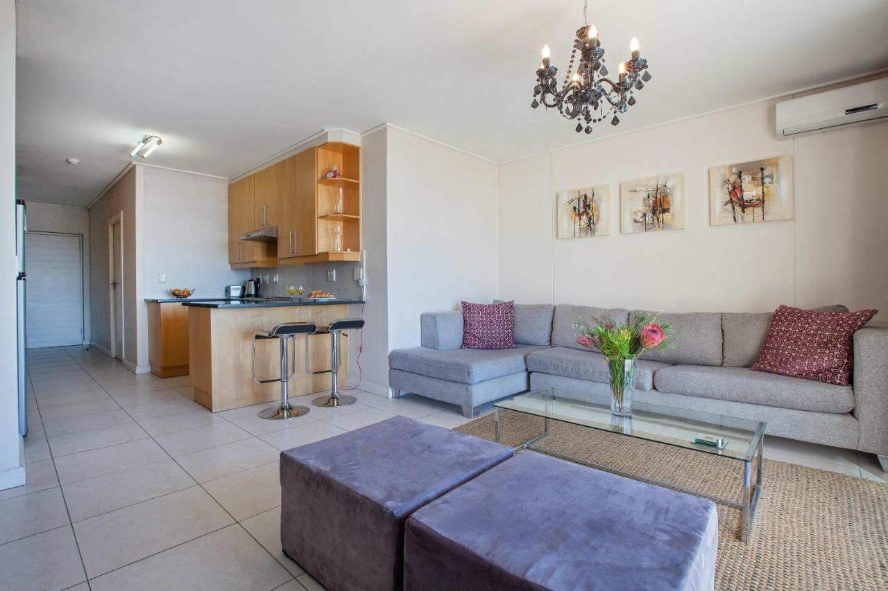 Walking into this apartment you have a passage with the bedroom to the left. Further on you enter the kitchen open plan with the living room leading onto the large balcony. The kitchen is well laid out with the cooking and preparing on the one side and the washing and cleaning on the other. The kitchen is fully equipped with fridge/freezer, washing machine, dishwasher, microwave oven, kettle and toaster. You also find a good supply of crockery and cutlery as well as cooking utensils. There is a large granite top counter with bar stools for having a meal or catching up on those emails. Very light and bright living room with L-shape comfortable couch leading onto the large balcony with spectacular views. The balcony has a patio table and two chairs – ideal for sundowners or to read the newspaper with a coffee in the morning sun. The curtains in the living room block out any light completely from entering making it possible to watch that great sporting event you don’t want to miss on TV – even in broad daylight. The living room also has two ottomans which fold out as single mattresses providing extra sleeping arrangements for children or to put your feet up. The bedroom with en-suite bathroom is at the back of the apartment as you enter from the elevator making it very quiet at night away from the sounds of the city. The modern bathroom features a large shower, toilet and basin with large mirror above. Both the living room and the bedroom has one accent wall covered with stunning wallpaper for that extra special feel. The apartment has free wifi, and air-conditioner in the living room.