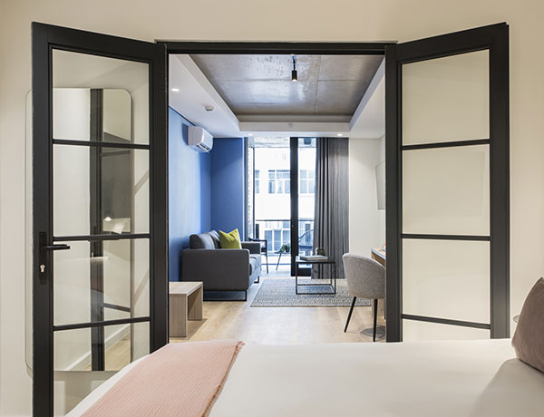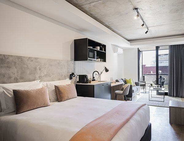 Home Suite Hotels – Station House Experience luxury at our aparthotel Cape Town suites, ideally positioned in one of the city’s most sought-after areas. With easy access to Sea Point’s premier work and play hotspots, Station House is the boutique aparthotel of choice for pleisure travellers from around the world, offering flexible self catering options to make you feel right at home. The Home Standard King At 43m², our modern Home Standard suite features an ensuite bathroom with a spacious shower, a plush king-size bed, a relaxing lounge area and a personal workstation. Enjoy city views from your private balcony. The Home Standard Twin At 43m², our modern Home Standard suite features an ensuite bathroom with a spacious shower, plush Twin beds, a relaxing lounge area and a personal workstation. Enjoy city views from your private balcony. The Home Superior At 43m², our modern Home Superior suite features an full kitchen, ensuite bathroom with a spacious shower, a plush king-size bed, a relaxing lounge area and a personal workstation. Enjoy city views from your private balcony. The Home Deluxe Enjoy the perfect blend of both comfort and luxury. Punctuated with modern design, our 46m² Home Superior Suite includes an ensuite bathroom and spacious shower, a plush king-size bed, a relaxing lounge area, and a personal workstation. Our favourite feature? The private balcony and city views. The Home Ultra Pooch Pad Bring along your furbaby! At 53m², this extra-roomy suite features an ensuite bathroom with a spacious shower, a plush king-size bed, a relaxing lounge area and a personal workstation. Enjoy city views from your private balcony, kitted out with bowls, toys and a bed for your special furry guest.