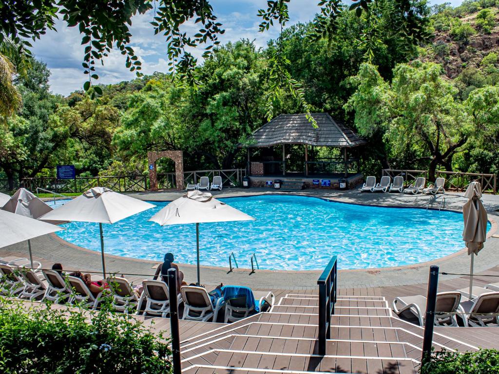 These comfortable facebrick chalets are set amongst shady trees at the edge of a river, near Hartebeespoort Dam. For water lovers there is fishing as well as 3 swimming pools on-site, 1 heated. However, other facilities are also available such as an a la carte restaurant , tennis, Mini-golf, volleyball, trampoline and action cricket as well as a zoo and snake park nearby.