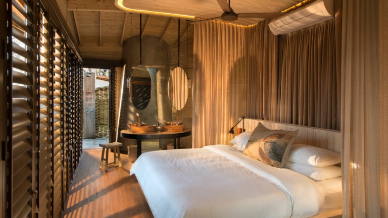 Overlooking a sparkling lagoon, the earthy glamour of this striking Lodge provides the perfect counterpoint to the natural bounty of this riverside landscape. A strong but playful recycled theme provides unusual accents at every turn.