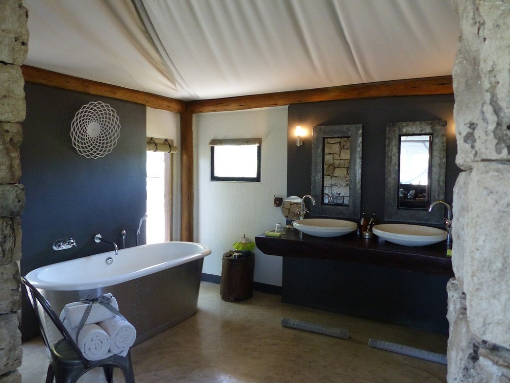 Like the bush where soft air blows against sharp thorns, Onguma Tented Camp is a study in contrasts. Textures such as stone, suede, linen and steel create a setting that is sleek and modern but also inherently of the earth. Inspired by a photograph of an Oryx on Etosha’s Fisher’s Pan, the interior echoes the colours of its natural surrounds. Grey, charcoal, black, white, and creams, together with a touch of muted or unexpectedly bright green, adds sophistication and earthiness to the atmosphere.