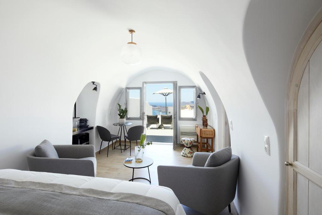 Our property is comprised of 23 luxury suites located just 2 kilometers from the vibrant life of Fira town in a quiet setting next to the picturesque Cycladic chapel of Agia Irini. Modernity and unparalleled style will provide the ultimate setting for your Santorini vacation, as our suites are true gems that offer you full amenities with the scenery of your dreams. The view is simply astonishing, as the sea unveils itself before you and the Mediterranean sun mirrors on its surface. Enjoy your holiday with the entire caldera surrounding you and unobstructed views which you will remember and cherish forever.