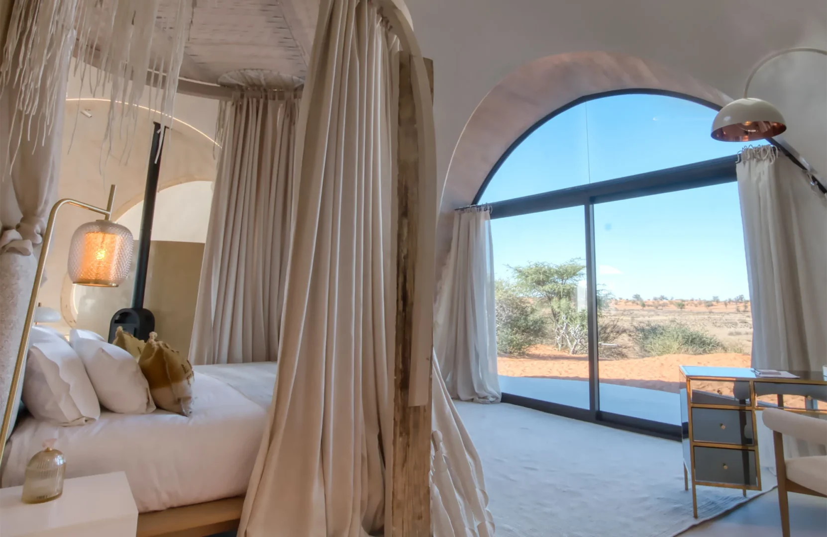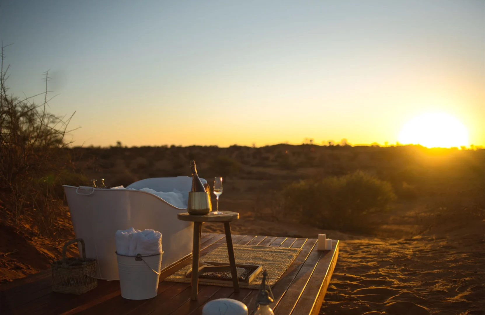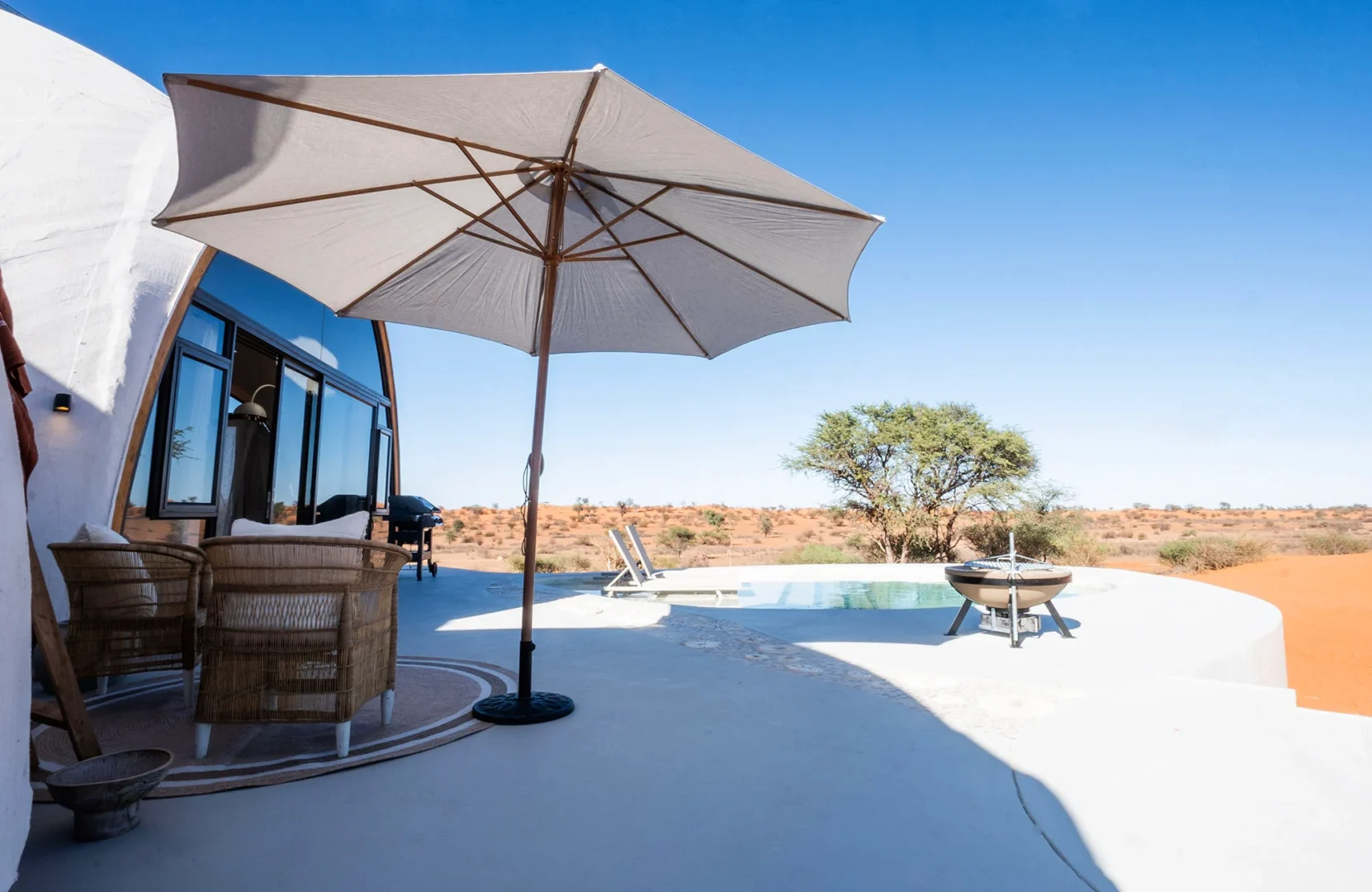 Embark on an extraordinary journey to the Reverie Kalahari Pod, hidden amidst the captivating red Kalahari dunes just 30 km northeast of Mariental. This exclusive oasis offers a lavish escape designed for two, inspired by the timeless traditions of the Khoi San people. Step into a realm where modern pressures fade away, and intimacy flourishes. The Reverie provides an all-encompassing experience, inviting you to disconnect from the clamour of everyday life and reconnect with your loved one amidst the vast expanse of the Kalahari Desert. Immerse yourself in a sanctuary of the senses, where the gentle whispers of the breeze through grass fields and the graceful dance of red sands along dune crests transport you to a realm of tranquillity. Listen to the enchanting melodies of Kalahari birdsong as you leave the world’s worries behind.