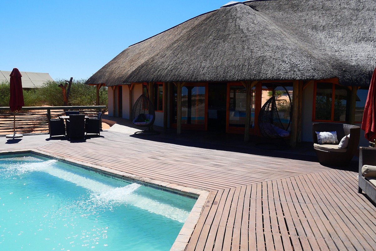 The main lodge area is also intriguing as it boasts a large deck that overlooks the entire shimmering pan and the warbling waters of the infinity pool release any tension. Guests can choose to have their meals in the communal dining room which also has a built in fire place and bean bags for guests to relax on or to enjoy their meal on the deck surveying the pans.
